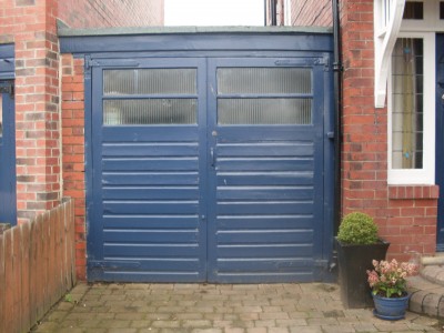 We replaced these old side hinged timber garage doors for our customers in Cullercoats. They wished to retain the style of garage door and having visited our showroom were able to see the more modern style of steel side hinged doors working in our showroom. They chose a Georgian design in black which once installed with new UPVC clad frames transformed their garage.